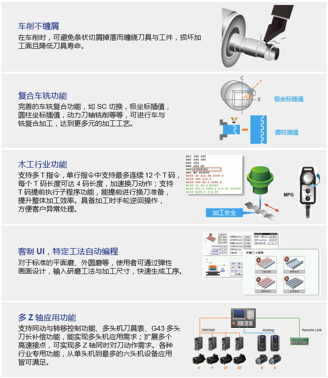 臺達新一代CNC B系列數(shù)控系統(tǒng),根據(jù)客戶需求和市場趨勢,整合HMI 平臺操作界面,可依照企業(yè)及行業(yè)需求,彈性化客制操作界面;并可搭配臺達伺服驅(qū)動器 ASDA-A3 / ASDA-B3 系列、永磁主軸系統(tǒng)及交流電機驅(qū)動器驅(qū)動主軸,以及通訊網(wǎng)絡 DMCNET 等進行高速數(shù)據(jù)傳輸及控制,達到控制機床的電機定速、定轉(zhuǎn)矩與精密定位。