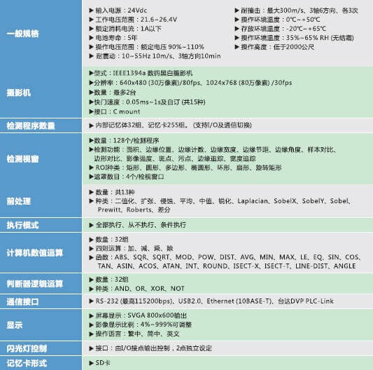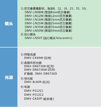 本系統主要是針對自動化生產線中,產品質量的瑕疵檢測、外觀尺寸測量、工件計數、識別確認以及自動化對位組裝等多項視覺檢測功能與需求而開發出來的產品,其檢測功能包含有『面積檢測』、『邊緣位置、寬度、角度、計數』、『瑕疵及斑點檢測』、『圖形比對、輪廓比對』、『字符識別』、『坐標、角度運算』、『尋邊測量』、以及『自動對位、坐標搜尋』等;用戶可以通過DMV控制器內部高速精準的多任務運算處理能力、人性化的操作界面以及多樣化的視覺檢測功能,來解決在生產線因為操作人員疲勞或疏忽造成的誤判,或是人眼無法識別出產品的缺陷以及因為高精密產品組裝不易等造成的各式各樣問題,進一步地全面提升生產線的產品質量、降低客退件數、增加設備產能以及減少企業的人工成本。
